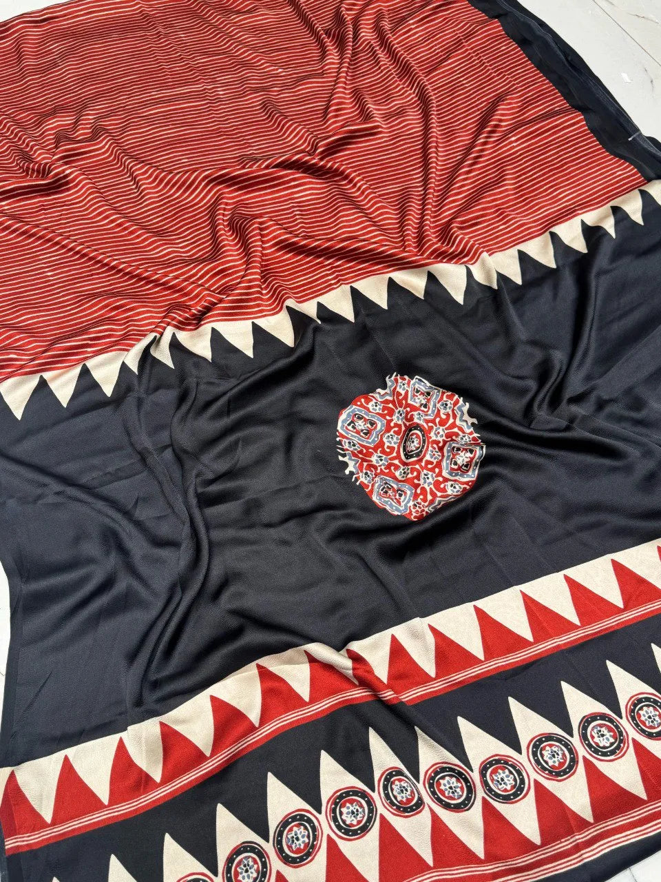 Trendy Designer Saree with Stripes and Ajrakh Print Pallu